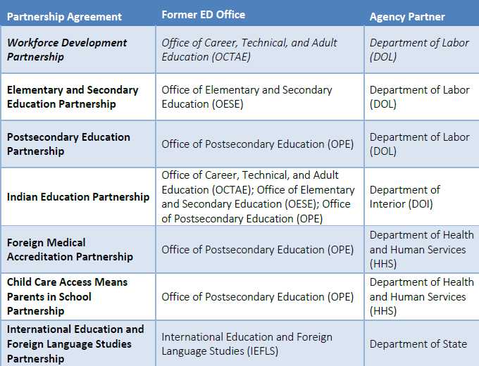 These agreements build upon actions from earlier in 2025, when the administration piloted this approach by shifting management of major career and technical education (CTE) and adult education programs from ED’s Office of Career, Technical, and Adult Education (OCTAE) over to the Department of Labor. Now, that pilot is becoming a broader strategy. Under these new agreements, ED maintains legal authority and oversight, but the operational work of running grant competitions, managing programs, and offering technical assistance moves to four other cognizant federal agencies.